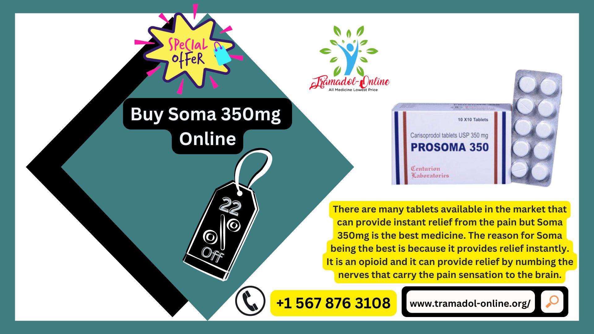 Soma 350mg is a prescription muscle relaxant that blocks the pain signals between the brain and nerves and relaxes the muscle to make a person feel comfortable. This medicine usually works best alongside physical therapy and is only useful for short periods. Long-term use does not have any significant benefits; instead, it increases the chances of developing a mental or physical dependence on it.