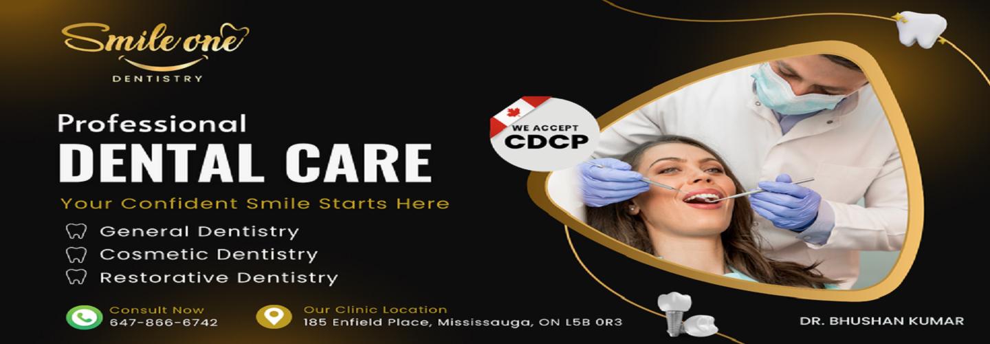 Smile One Dentistry is a dental office located in Mississauga, providing care for patients of all ages. Led by Dr. Bhushan Kumar, the clinic offers a wide range of dental services designed to address routine, preventive, cosmetic, orthodontic, and restorative needs. Services include general dentistry such as exams, cleanings, tooth fillings, and extractions, as well as cosmetic treatments including teeth whitening and veneers. Orthodontic options like braces and Invisalign are also available, along with restorative solutions such as dentures and dental implants.
