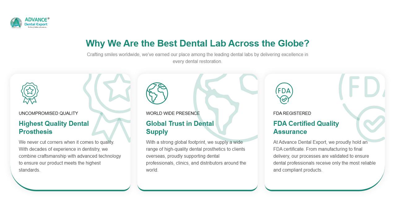 Embracing the digital revolution, ADE utilizes cutting-edge technologies such as CAD/CAM systems, 3D imaging, and laser welding to deliver precise, aesthetic, and durable dental prosthetics. Our in-house production model guarantees faster turnaround times and minimal adjustments, enhancing patient satisfaction. By integrating advanced digital workflows and maintaining a client-centric approach, Advance Dental Export continues to set benchmarks in the dental industry, redefining smiles with precision and artistry.
