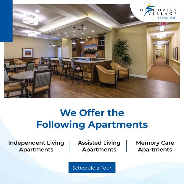 Discovery Village Clear Lake offers homelike senior living in Webster, TX, with exclusive amenities. In our community, residents will experience the top-tier Independent Living in Webster, TX, ensuring you or your loved ones enjoy autonomy. In addition to our standard amenities, we proudly provide specialized Memory Care and Assisted Living in Webster, TX, catering to individual needs with dedicated support and personalized services. Discover the unparalleled comfort awaiting you or your loved ones at Discovery Village Clear Lake.