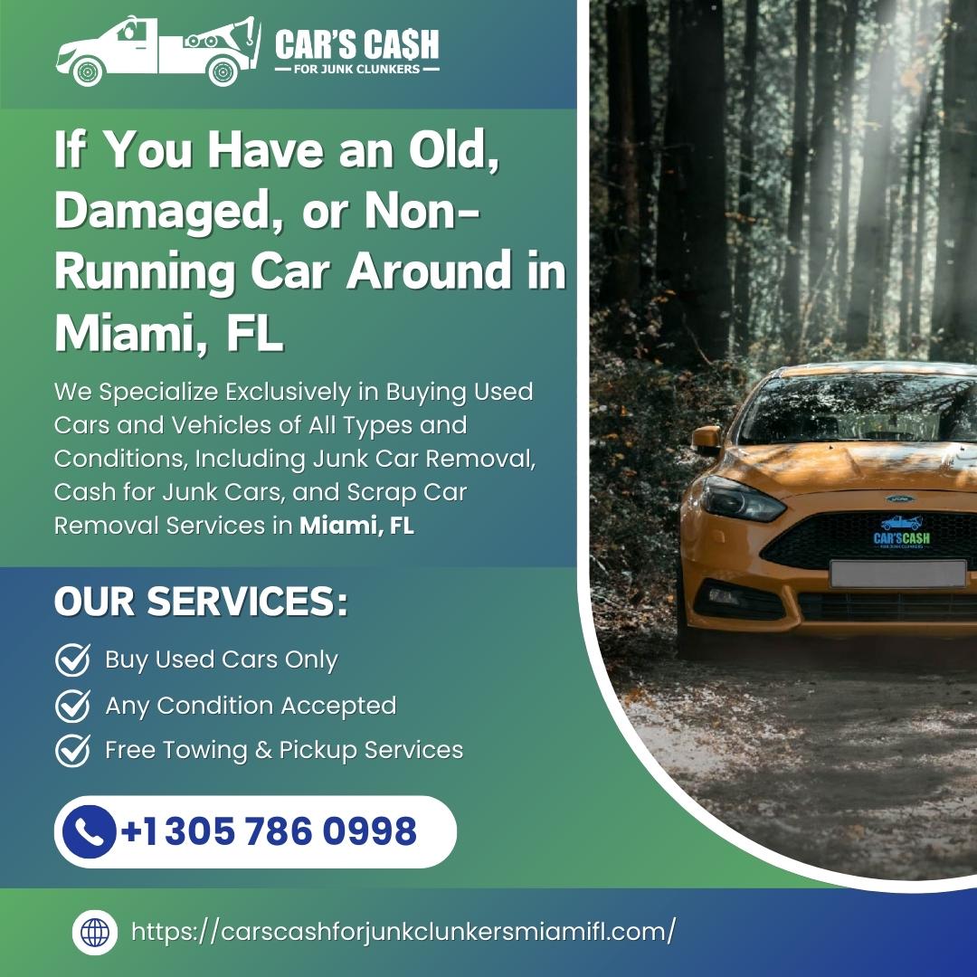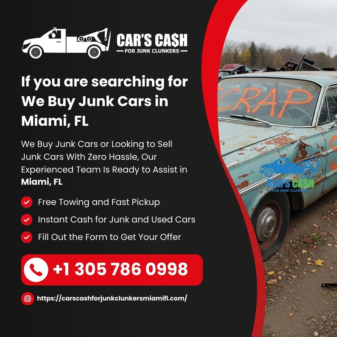 Cars Cash For Junk Clunkers is a trusted and reliable junk car buyer in Miami, FL, offering fast and fair cash for cars in Miami FL. We specialize in cash for junk cars Miami FL, buying old, damaged, wrecked, scrap, or non-running vehicles in any condition. If you’re looking to sell junk cars in Miami FL, junk my car Miami FL, or sell my car for cash Miami FL, we make the process quick and stress-free. As one of the top used car buyers in Miami FL, we provide same-day pickup, free junk car removal in Miami FL, and instant cash payment. Whether you need cash for clunkers Miami FL, scrap my car Miami FL, or are searching for cash for cars near me Miami FL, our professional team is ready to help. We proudly serve Miami and surrounding areas as a dependable clunker junker Miami FL and buy junk cars near me Miami FL service. Call (786) 936-5564 today for top dollar and fast service.