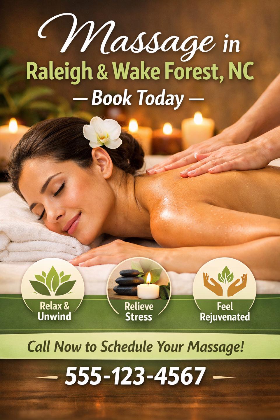 Raleigh massage is a professional massage therapist practice located at Salem Woods Drive in Raleigh, NC. They specialize in therapeutic and relaxation-focused massage services designed to reduce muscle pain, relieve physical tension and stress, and help restore physical balance and well-being through tailored massage sessions.