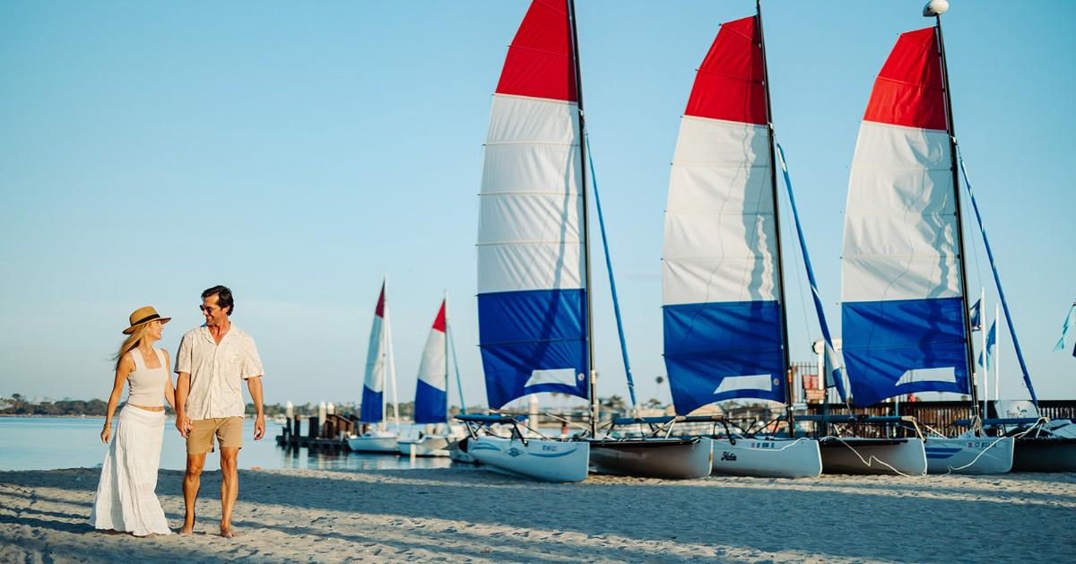 Welcome to the Catamaran Resort Hotel and Spa, a tropical hideaway in San Diego’s Pacific Beach community. Our Polynesian-themed resort, only 8 miles from San Diego International Airport, offers casual elegance with palm trees, lush vegetation, tiki torches, koi ponds, waterfalls, and exotic birds that like to strike up conversations with guests. With Mission Bay as our backyard and the Pacific Ocean across the street, there's no better choice among Pacific Beach San Diego hotels.