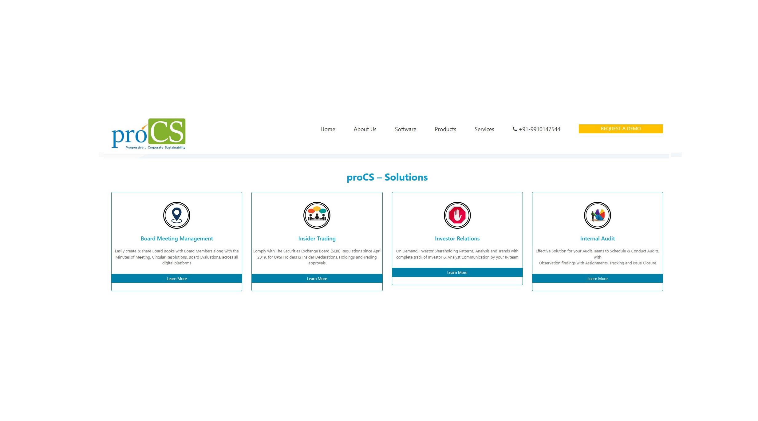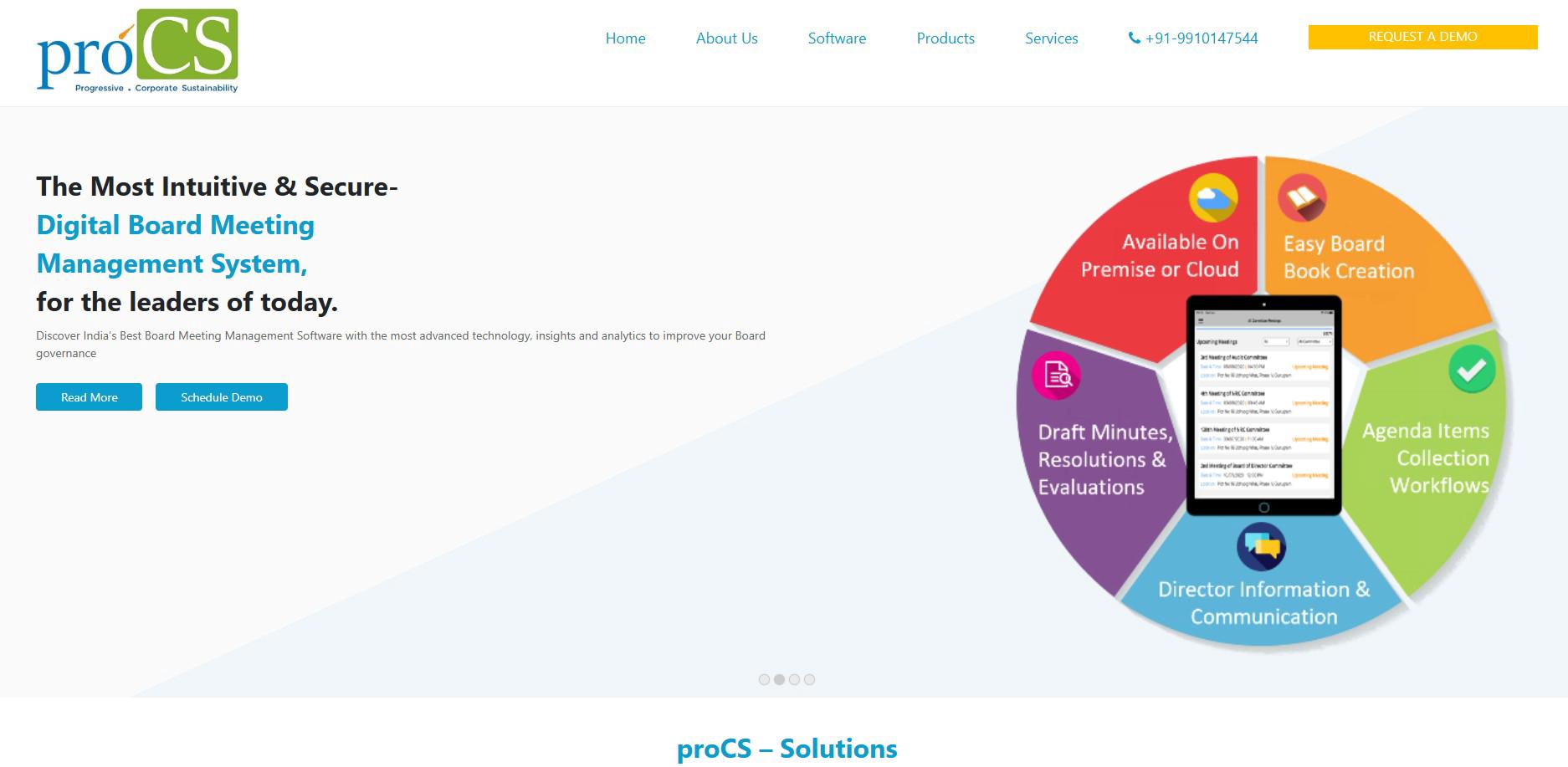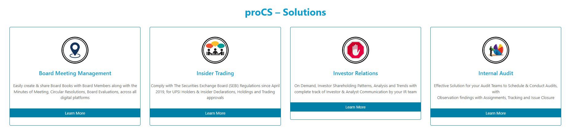 ProCS Solutions is a leading provider of governance and compliance software solutions, specializing in SEBI-compliant tools for board meetings, insider trading, investor relations, and internal audits. Their suite includes digital board meeting management, insider trading compliance, investor shareholding analysis, and audit issue tracking. Designed for corporates, compliance officers, and board members, ProCS streamlines regulatory adherence and enhances corporate governance. With a user-friendly interface and mobile app support, ProCS empowers organizations to manage compliance processes efficiently and securely. Their clientele includes prominent Indian corporates and listed companies.
