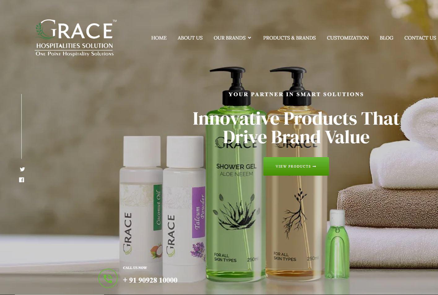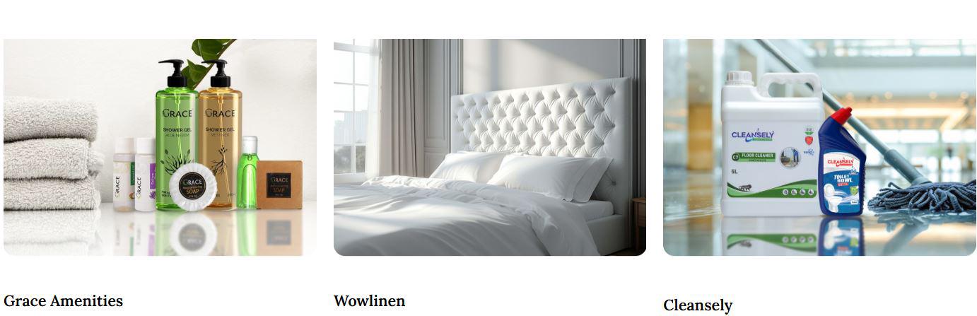 Grace Hospitalities supplies premium hotel linen and complete hospitality solutions across India. Their products include 100% cotton hotel and resort linen, antimicrobial hospital sheets, guest toiletries, custom amenity kits, and hygiene solutions like cleaning chemicals and sanitizers. They offer customization in size, GSM, colors, embroidery, fragrances, and packaging. With over 10 years of experience, they serve hotels, resorts, boutique stays, hospitals, clinics, and wellness centers, managing bulk and multi-property supply needs.