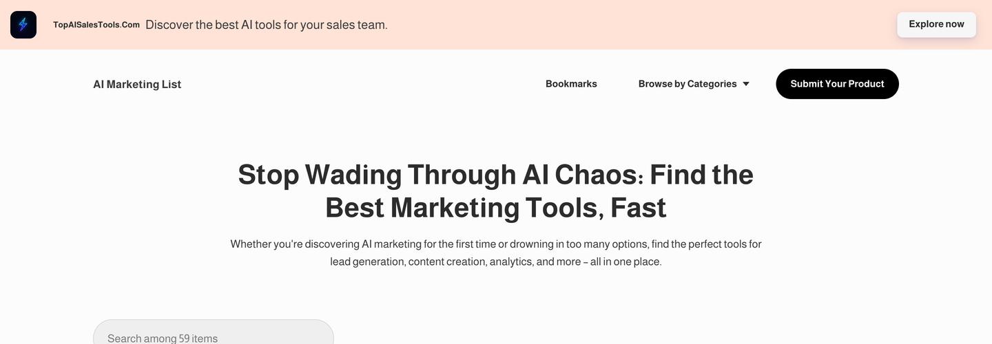 AI Marketing List is your ultimate resource for finding the smartest AI-powered tools to supercharge your marketing workflow. From content generation and email automation to SEO, social media, and analytics, this curated platform helps marketers uncover cutting-edge solutions that boost efficiency, cut costs, and drive real results. Whether you're a solo creator or part of a full-stack team, AI Marketing List helps you stay ahead in the fast-moving world of digital marketing.