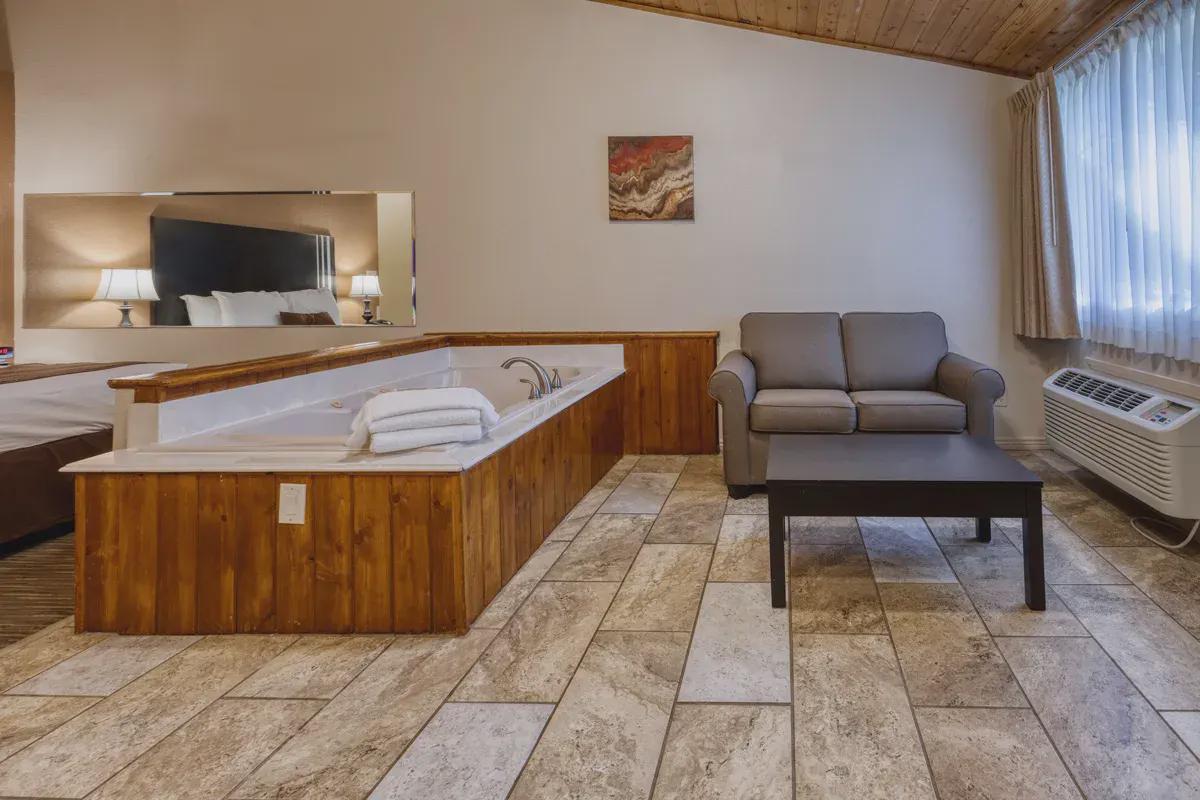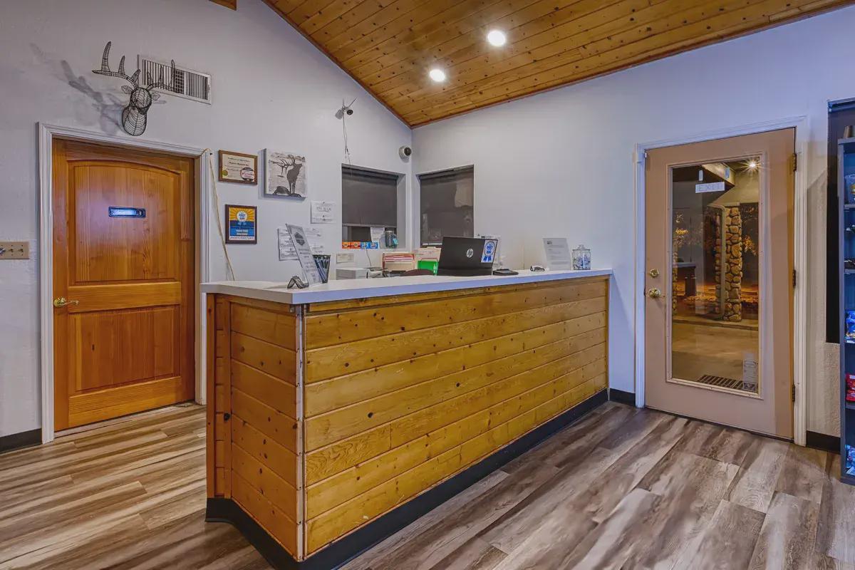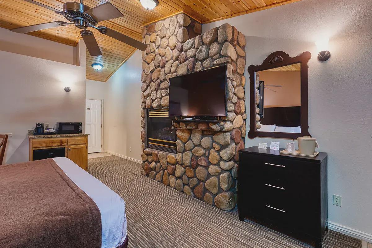 The exterior of Majestic Mountain Inn exudes rustic charm, with its log cabin architecture seamlessly blending into the natural landscape. As you approach, the scent of pine wafts through the crisp mountain air, creating an immediate sense of calm. The inn's welcoming facade, adorned with warm hues and native stone accents, sets the tone for the cozy retreat that awaits within.