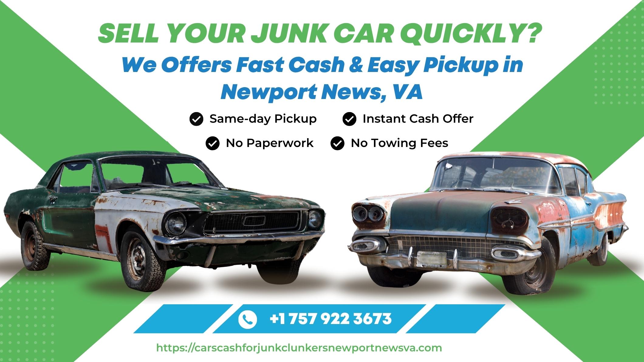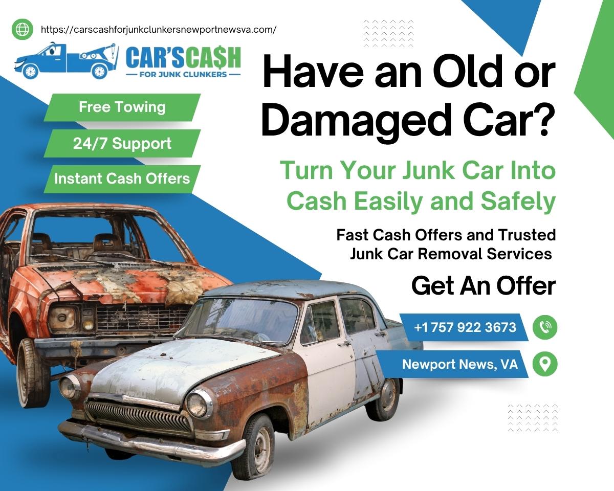 Cars Cash For Junk Clunkers in Newport News, VA offers fast and reliable same-day pickup for junk cars. We make it easy to sell your car in Southampton, sell used cars, or get junk car removal in Williamsburg with top cash offers. Looking for cash for junk cars near me, junk car pickup in Williamsburg, or a trusted junk yard near me? We provide hassle-free car removal in Newport News with quick service and fair payouts. Call us at (757) 922-3673 to sell your car for cash today.