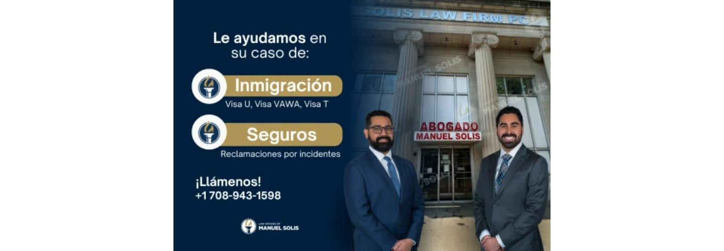 Abogado de Inmigración Manuel SolÍs, con más de 34 años de experiencia y 50,000 casos ganados, le guÍa en su trámite de visa humanitaria: visa U, visa VAWA, visa T, visa juvenil, permiso de trabajo en USA y residencia permanente en USA. Contamos con representación legal en todo Estados Unidos y también ofrecemos asesorÍa en áreas legales como derecho familiar, accidentes, negligencia médica, derecho civil y criminal. Nuestro equipo de más de 200 profesionales analiza cada situación de manera detallada, elaborando estrategias legales personalizadas que buscan proteger sus derechos. Ofrecemos servicios legales en español e inglés, brindando atención cercana, asesorÍa confiable y compromiso total con cada cliente migratorio o legal.