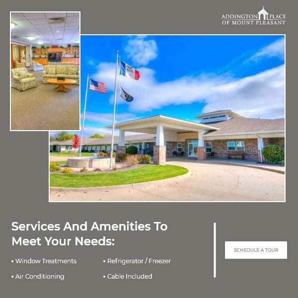 Addington Place of Mt. Pleasant is a retirement community specializing in senior living in Mount Pleasant, IA. Our areas of expertise include assisted living, Memory Care, and respite care. Residents can access a wide range of amenities, senior-friendly lifestyle programs, and modern conveniences. In addition to a comfortable and stress-free stay, seniors can socialize and enjoy the fresh air and outdoor spaces here without worry. Our senior living professionals are trained to provide personal care and to monitor the needs of all seniors living here. Contact us today if you'd like to know more!