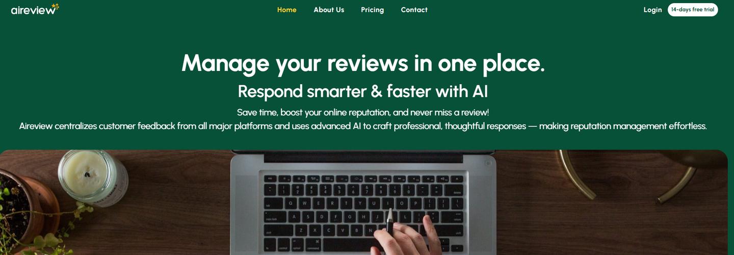 Aireview is a comprehensive SaaS platform designed for small and medium businesses to efficiently manage their online reputation. It integrates with multiple review platforms such as Google, Facebook, and Yelp to aggregate reviews into a single dashboard. Powered by AI, Aireview automates professional and personalized review responses in seconds, helping businesses save time and overcome language barriers.