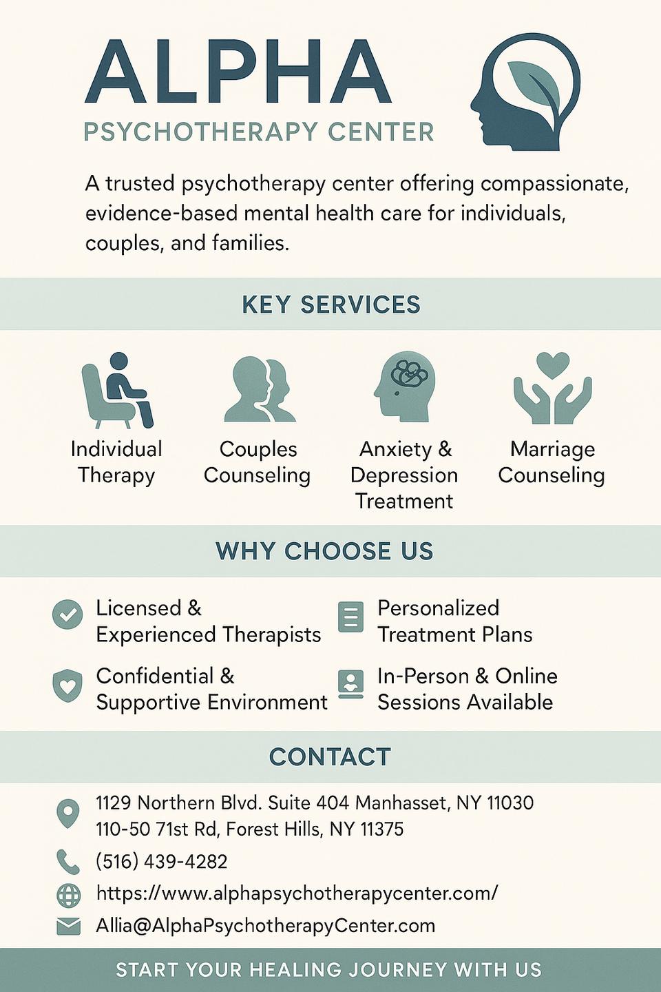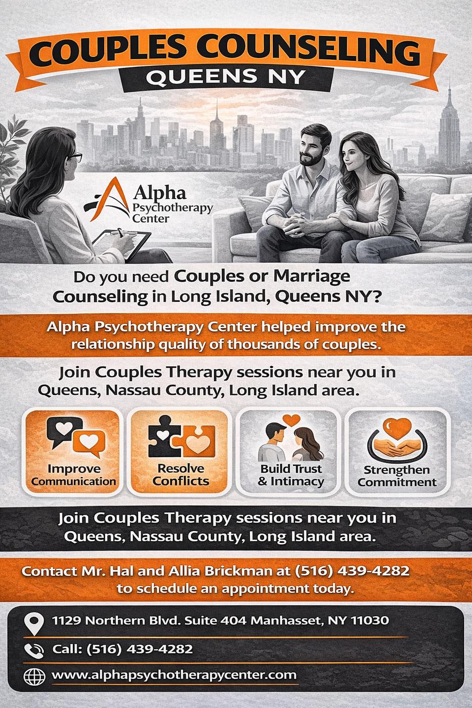 Do you need couples or marriage counseling in Long Island, Queens NY? Mr. Hal Brickman has 45 years of experience in Couples Therapy and Marriage Counseling in Long Island. If you are looking for Gottman Couples Therapy in Manhattan, Queens, and Long Island NY? Meet Allia Brickman at Alpha Psychotherapy Center, Allia is Gottman-Level-3-Certified in couple’s therapy, bringing over 40 years of research-backed tools and techniques to help you reach your relationship goals. Contact Mr. Hal and Allia Brickman at (516) 439-4282 to schedule an appointment today.