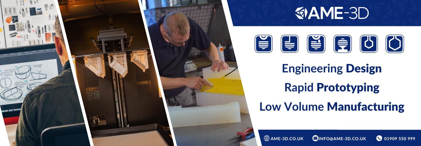 Your Trusted Partner in Product Design, Rapid Prototyping, and Low-Volume Manufacturing. Based in Sheffield and ISO 9001:2015 certified, we specialise in bringing innovative ideas to life. Our end-to-end product development solutions are tailored to meet the unique needs of each project, combining precision, quality, and speed. Our technologies include: -Full in-house product design department -3D Printing (SLA, SLS, MJF, LCD) -Reaction Injection Moulding -Vacuum Casting -CNC Machining Whether you need a one-off part, low-volume production, or support with product design, we deliver exceptional results with efficiency and reliability. Experience the seamless integration of design, prototyping, and production with AME-3D.