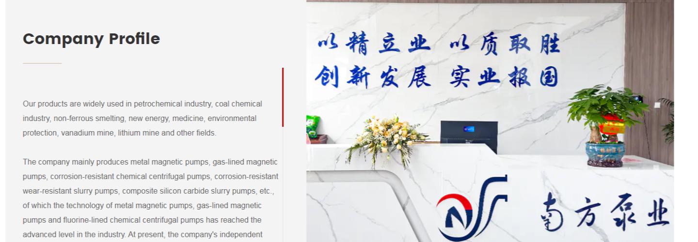 The company mainly produces metal magnetic pumps, gas-lined magnetic pumps, corrosion-resistant chemical centrifugal pumps, corrosion-resistant wear-resistant slurry pumps, composite silicon carbide slurry pumps, etc., of which the technology of metal magnetic pumps, gas-lined magnetic pumps and fluorine-lined chemical centrifugal pumps has reached the advanced level in the industry. At present, the company's independent research and development design and production of kryptonite lined magnetic pump flow up to 1000mh, head 50 meters, supporting motor power 185KW, metal stainless steel magnetic pump flow up to 1,000m%h, IHF type kryptonite lined centrifugal pump flow up to 3,600mhh, head 36 meters, supporting motor power 710KW, for the first set, fill the gaps in the domestic field, the performance has reached the international advanced level. The performance reaches the international advanced level. The company has a modern industrial plant, technology research and development building, senior personnel apartment, high-power metal, village fluorine leakage-free magnetic pump pilot test vehicle and magnetic processing center and other facilities, has been awarded the “National Pump Inspection Center Cooperation Unit”, “Green Factory in Anhui Province”, “Enterprise R & D Center in Anhui Province”, “National Pump Inspection Center”, “National Pump Inspection Center”, “National Pump Inspection Center”, “National Pump Inspection Center”, “National Pump Inspection Center” and so on. Anhui Province Enterprise R&D Center“, ”Provincial Industrial Design Center" and other honorary titles. The company has a domestic market department, international trade department, and set up offices abroad, with import and export rights, products are exported to many countries at home and abroad.