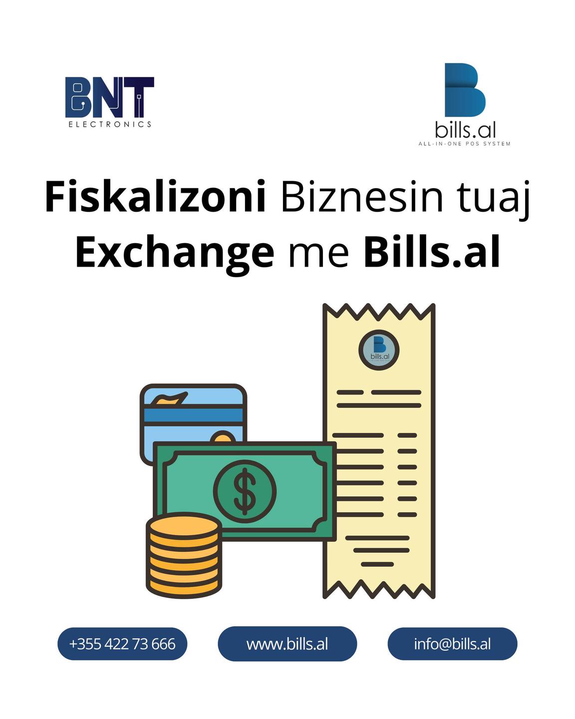 Bills.al, një program POS All-in-One projektuar dhe zhvilluar nga BNT Electronics, ofron zgjidhje fiskalizimi të personalizuar për menaxhimin e bizneseve të të gjithë llojeve dhe madhësive. Ne ofrojme siguri dhe suport teknik 7 ditë në javë, në të gjithë Shqipërinë.