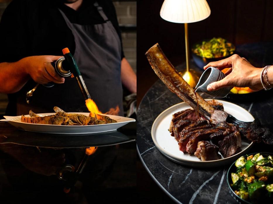 Blossom Steakhouse exudes an ambience of modern elegance, with an interior design that reflects sophistication and comfort, featuring plush seating, ambient lighting, and tasteful décor that combine to create an inviting atmosphere. The seating areas include an indoor dining room, outdoor balcony seating overlooking the Indian Ocean, and a private VIP room.