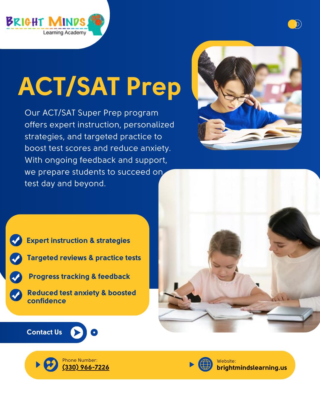 Bright Minds is a Test-Prep and Tutoring center for all-subjects and all grades. We offer a comprehensive ACT/SAT test prep for high school students. Parents who are for remedial or enrichment, we have many programs available to fit every childs needs.