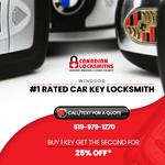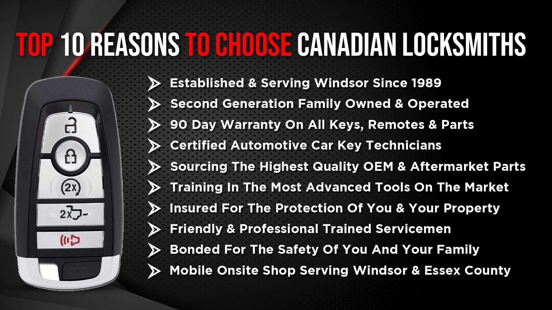 Canadian Locksmiths has served Windsor and Essex County since 1989, making us the longest-established automotive locksmith in the region. As a second-generation family business with over 35 years of experience, we've built our reputation on one simple principle: do the job right the first time, every time. Our fully-equipped mobile locksmith van comes directly to your location—whether you're stranded in a parking lot, stuck at home, or need service at your workplace. No towing required, no waiting days for a dealership appointment. What sets us apart is our investment in dealer-level diagnostic equipment that most locksmiths simply don't have. This allows us to handle the complex European vehicles and advanced security systems that others turn away—BMW, Mercedes, Audi, Porsche, and more. We're the locksmith other locksmiths call when they encounter a job they can't complete. While Ford, GM, and Chrysler make up the majority of our daily work, our specialty is solving the problems nobody else can. Every job comes with our workmanship warranty, and our technicians are fully bonded and insured through the Association of Ontario Locksmiths and CAA certified for your complete peace of mind. We carry the largest inventory of key blanks in Windsor, meaning same-day service is possible 70% of the time with next-day guaranteed for the rest. With 200+ five-star Google reviews, our customers consistently praise our professionalism, fair pricing, and expertise. When you need a car key cut, programmed, or repaired, Canadian Locksmiths delivers dealer-quality results at a fraction of the cost—right in your driveway.