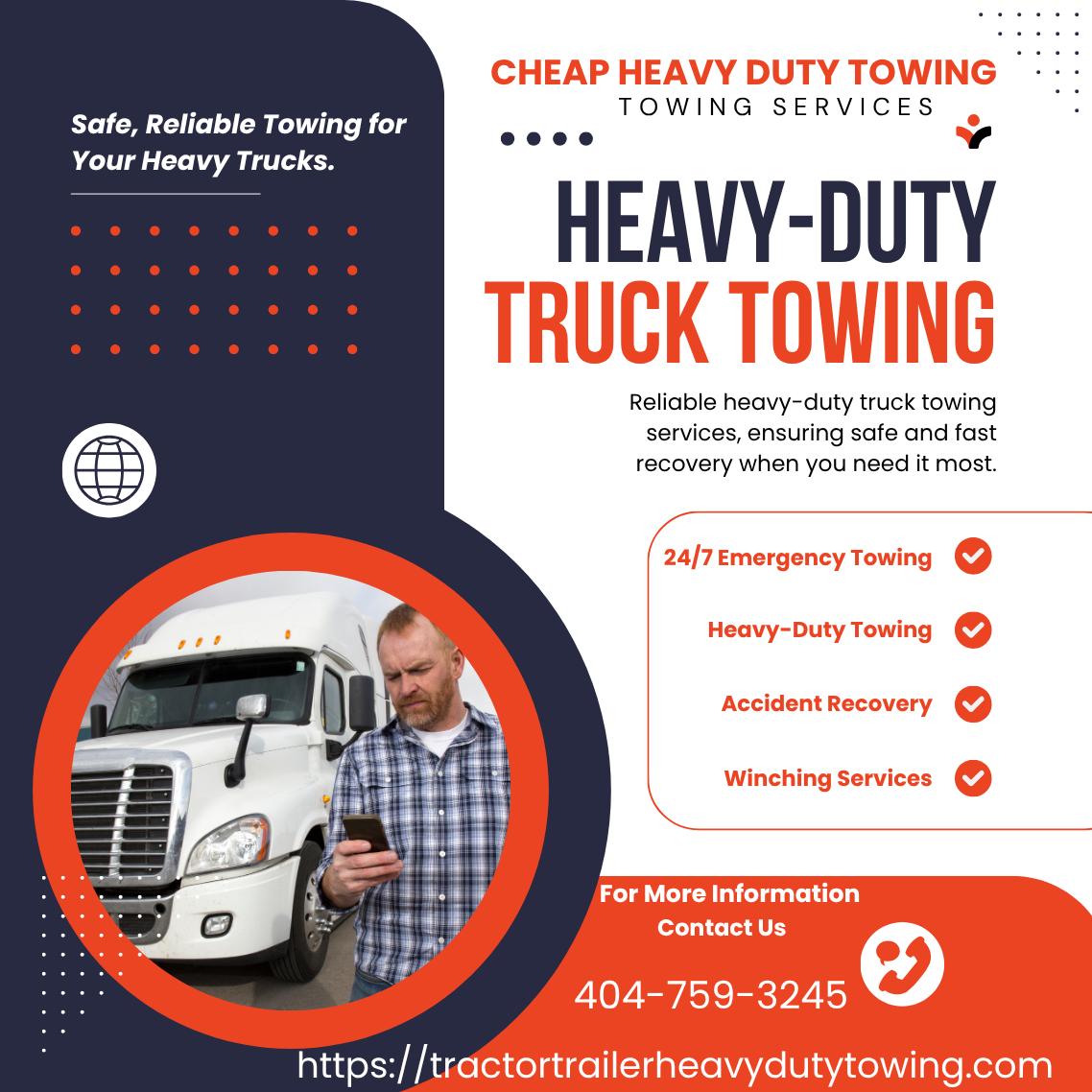 Known for dependable service across Atlanta, Cheap Heavy Duty Towing is ready when you need expert commercial towing, semi truck towing, or tractor trailer hauling. Call 404-759-3245 and ask for Melvin Mann for immediate assistance. ๐