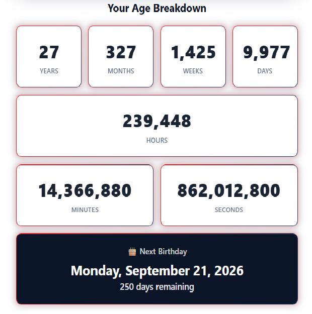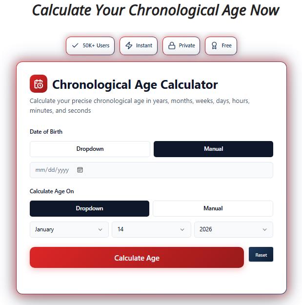 A chronological age calculator is a simple tool that calculates your exact age using your birth date and the current date or any specific date. It considers leap years, non-leap years, and different month lengths to provide accurate and precise results. This age calculator shows age in years, months, days, total hours, and total minutes without manual math. Chronological age calculation is widely used for official documents, legal documentation, visa applications, and medication dosing. With a built-in date picker, users get instant results, while features like fun facts and date difference make it both useful and easy to understand.