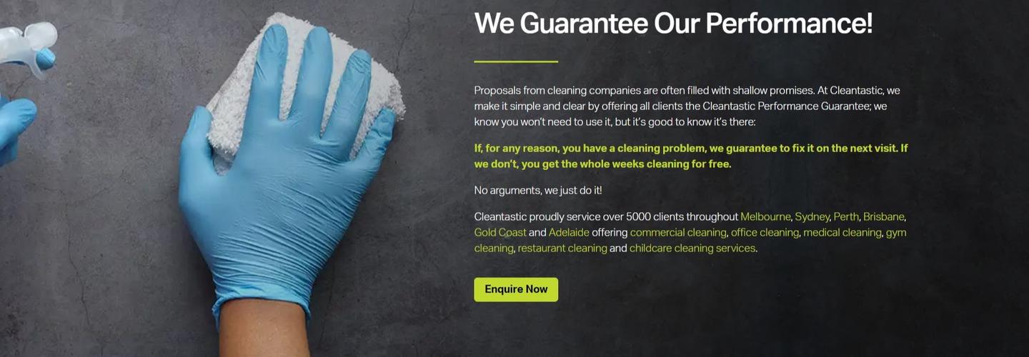 Cleantastic has over 20 years of commercial cleaning experience and we service more than 5,000 clients worldwide. Our vast experience in all sectors of commercial cleaning services means you can rely on Cleantastic. We’ll keep your business immaculate, which for you means increased revenue and productivity.