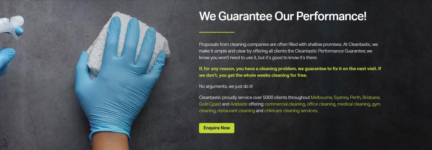 Cleantastic is a nationwide provider of commercial cleaning services. We are proud to be industry leaders, trusted by over 8,000 clients across Australia. Our over 900 franchisees are highly motivated, professionally trained owner-operators who truly care about their clients and service outcomes. If you’re looking for a commercial cleaner or to launch your own cleaning business, contact Cleantastic today.