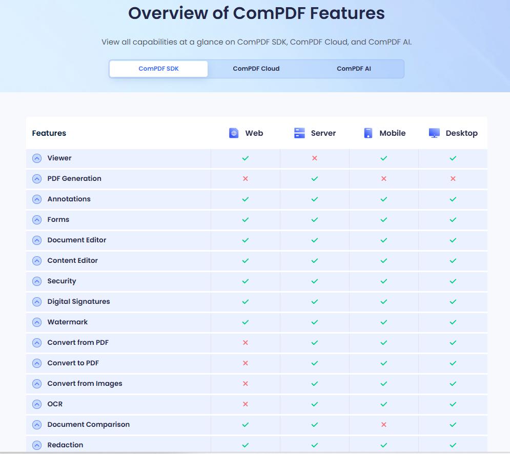 - ComPDF SDK is highly compatible with web, server, desktop, and mobile platforms, seamlessly integrating with various development frameworks. It provides features lincluding generation, viewing, editing, conversion, signing, etc.