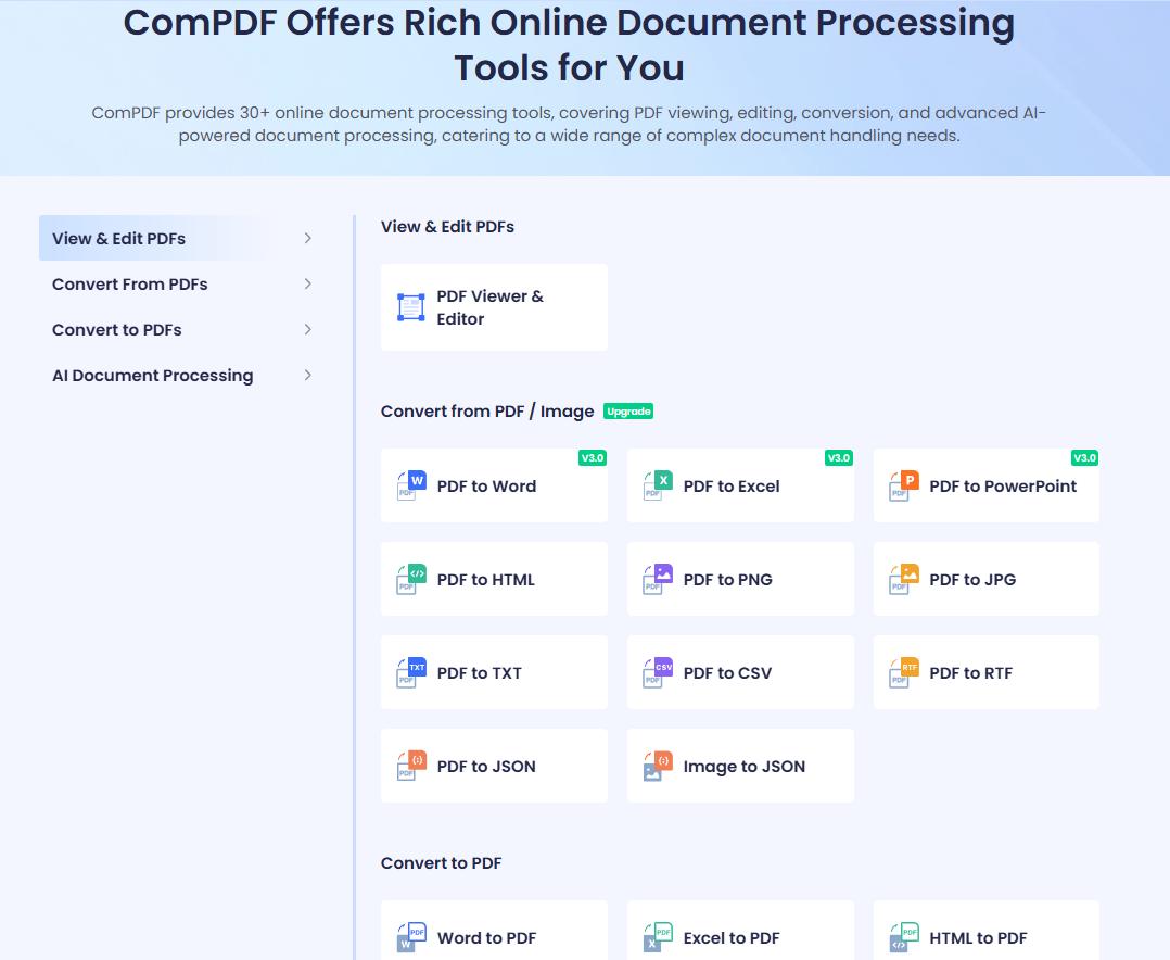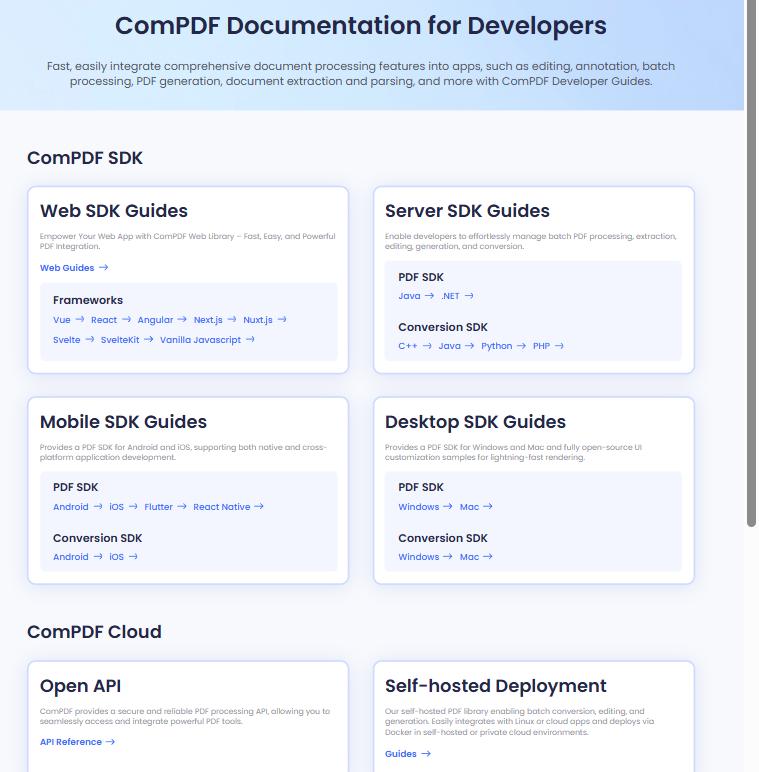 - ComPDF Cloud delivers a secure, stable, and efficient service environment, simplifying enterprise document processing and business integration workflows. With the flexibility to use either Open API calls or private deployment, enterprises can generate, edit, convert, OCR recognize, and extract data.