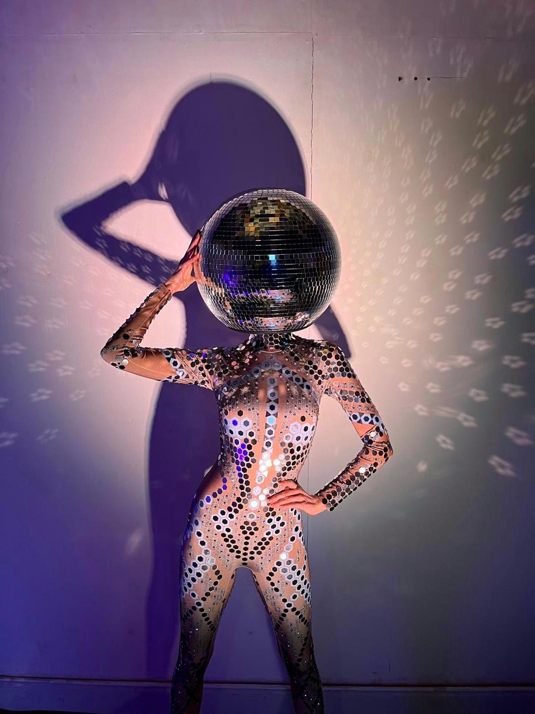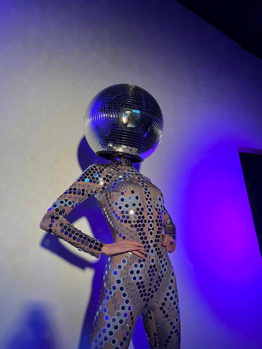 We offer customised entertainment packages to fit any event, from corporate gatherings to themed parties. Our disco ball head costumes can be adapted to your theme, whether futuristic or tropical.
