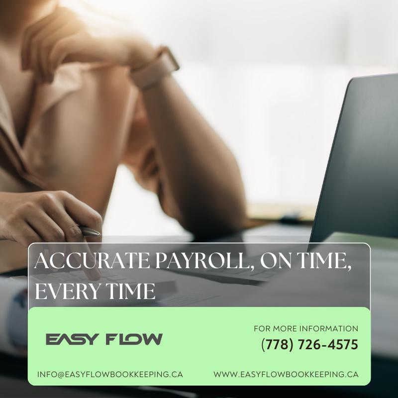 Our payroll management services are designed to help you save time and reduce errors. By outsourcing your payroll to Easy Flow Bookkeeping, you can ensure that your employees are paid accurately and on time. If you're searching for bookkeeping Abbotsford or Abbotsford bookkeepers, our services are customized to suit your business's payroll requirements, ensuring compliance with all regulations while saving you from time-consuming administrative tasks.