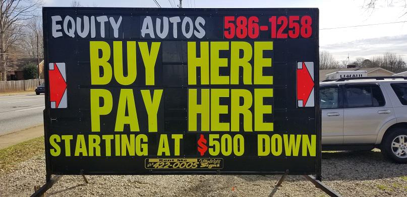 Buy here-Pay here on lot financing and there are never any credit checks. Here at Equity Autos, we say "Buy an Investment.Not Just a Car", because we never charge any INTEREST, allowing BIG SAVINGS.!! The price that you SEE, is the price that you PAY. Many people purchase $15,000 vehicles, with the actual VALUE of that vehicle being worth only $6-8000. This happens, because of SUPER HIGH interest rates and the overpricing of vehicles. Purchasing a vehicle from Equity Autos, allows the customer to drive the vehicle, then re-sell or trade the vehicle, recouping most of the vehicles original purchase price, minus wear and tear, thus SAVING MONEY!!