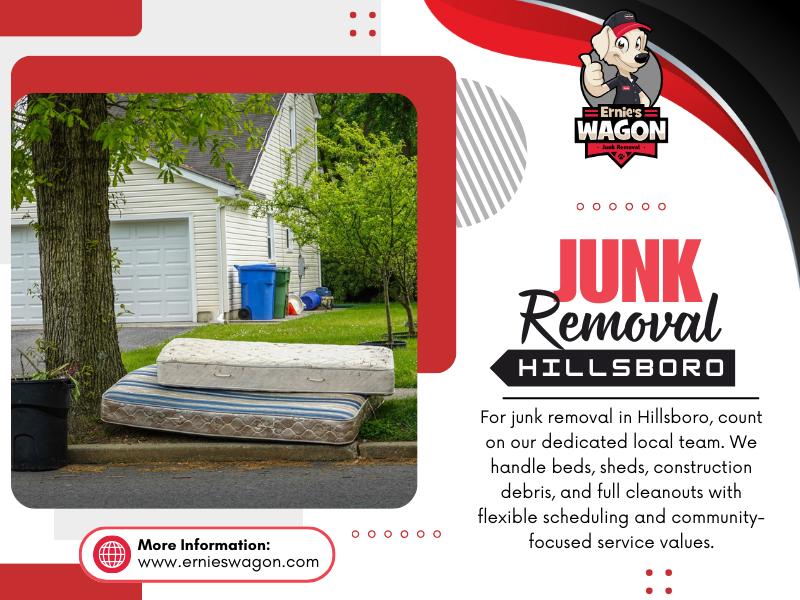 At Ernie’s Wagon Junk Removal we specialise in making clutter disappear—quickly, efficiently and with a smile. Based in Hillsboro, Oregon, our family-run team uses a large-capacity 15-yard trailer to haul away everything from old appliances, furniture, mattresses and construction debris to decks, fences, sheds and unwanted hot tubs. We offer same-day and curb-side pickup, transparent pricing and flexible scheduling (7 am to 9 pm daily). We’re committed not just to clearing space for you, but also to supporting the community and protecting the planet through recycling efforts. When you need reliable junk removal in Hillsboro, Tigard, Beaverton or nearby, you can count on us for honest service, affordable rates and a clutter-free result. Get a free estimate today!