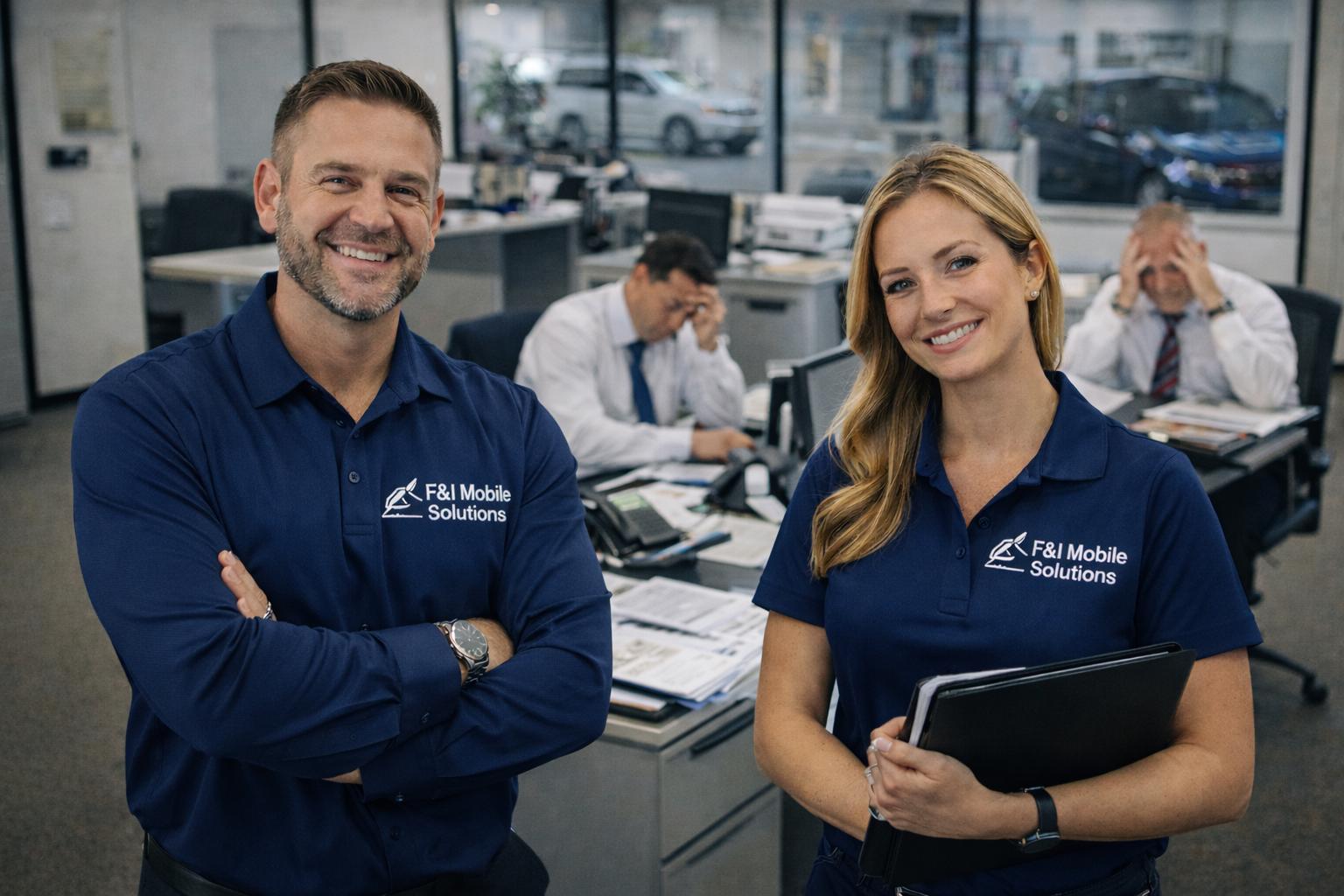 F&I Mobile Solutions provides professional, compliant, and on-demand mobile Finance & Insurance (F&I) support for licensed auto dealerships. As a trusted extension of your dealership’s F&I office, we assist with off-site deliveries, remote transactions, and overflow coverage while maintaining full dealer control over products, pricing, approvals, and customer relationships. Our dealer-first approach ensures secure document execution, funding readiness, and strict compliance with federal and state regulations, including GLBA standards. We never alter deal structures or store customer data beyond authorized engagement. F&I Mobile Solutions helps dealerships improve operational efficiency, maintain process integrity, and deliver seamless customer experiences beyond the showroom floor.