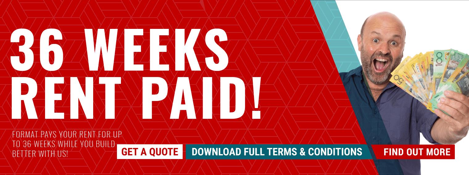 To make the home-building process even easier, Format Homes offers a unique Rent Assist Program, allowing clients to live rent-free for up to 36 weeks while their home is being built. This helps alleviate financial stress and makes transitioning into your new home seamless.