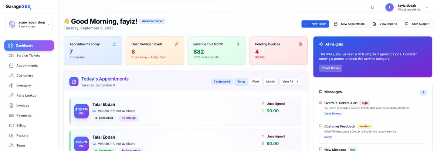Garage360 is a cloud-based auto repair shop management software designed to modernize and streamline operations for independent auto repair shops, garages, and service centers.
