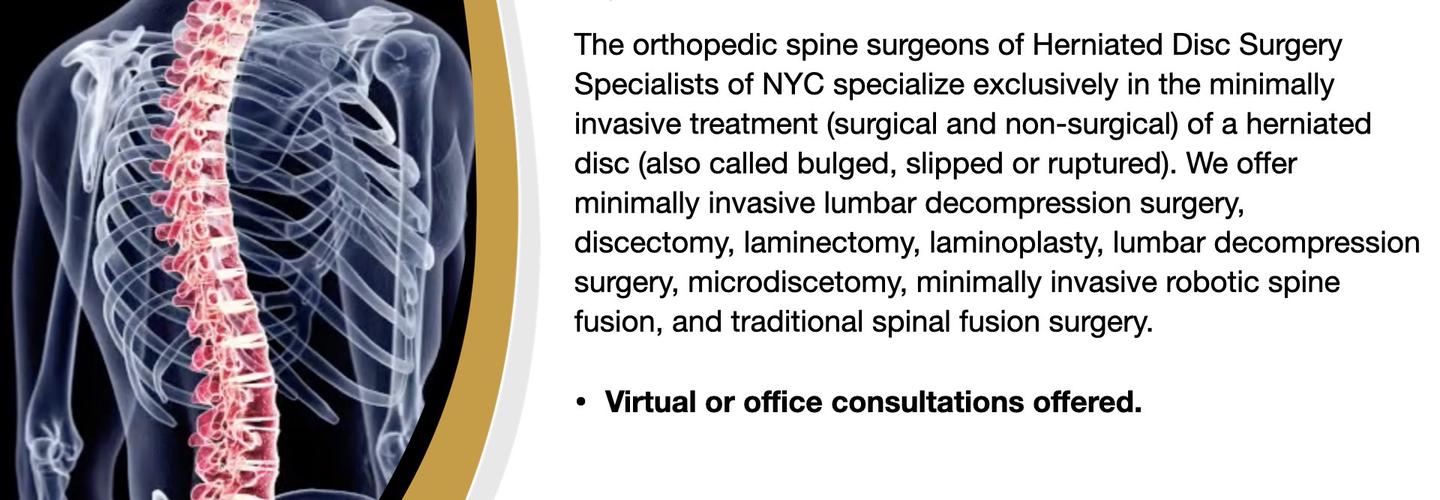 The orthopedic spine surgeons of Herniated Disc Surgery Specialists of NYC (Upper East Side, Manhattan, NY) specialize exclusively in the minimally invasive treatment (surgical and non-surgical) of a herniated disc. We offer minimally invasive lumbar decompression surgery, discectomy, laminectomy, laminoplasty, lumbar decompression surgery, microdiscetomy, minimally invasive robotic spine fusion, and traditional spinal fusion surgery. We are a highly specialized group of NYC board certified orthopedic spine (back) surgeons who provide world-class, evidence-based orthopedic spine surgery. By focusing solely on herniated disc diagnosis, treatment, and surgery we have become truly exceptional at what we do, and have achieved a reputation for excellence across New York, the United States and internationally. Offering virtual and in-office consultations.