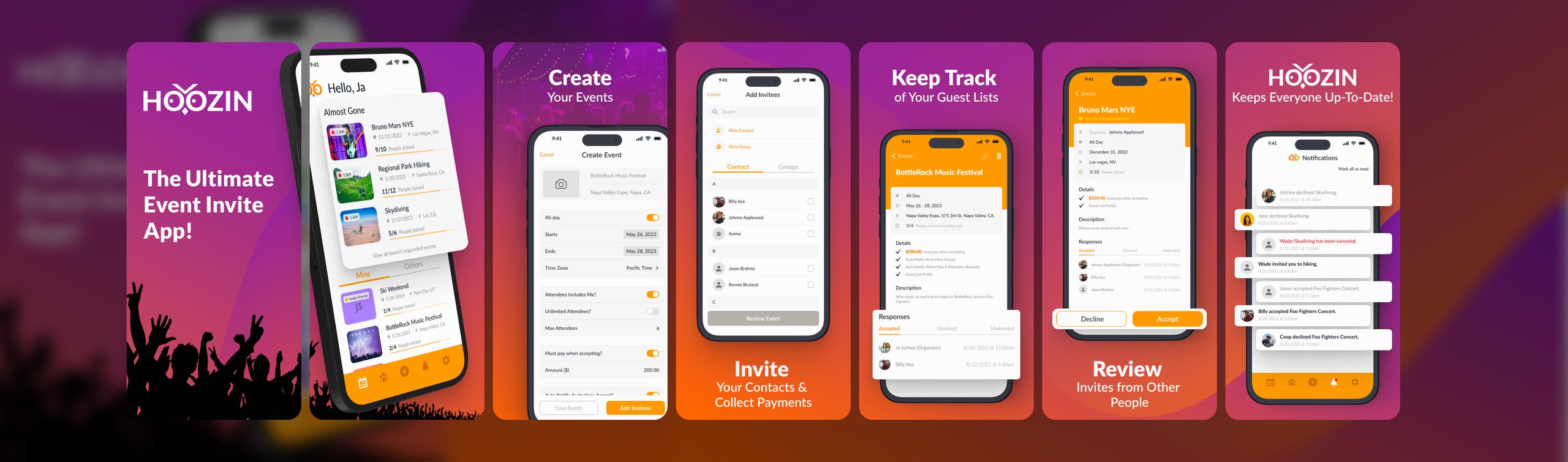 Hoozin is the ultimate event invite app, centralizing all of the event invitation activity that currently lives across multiple scheduling, communications, and payment platforms into a single app. Then we supercharge it with a FOMO-powered notification system that takes all the pressure off the event organizers and motivates the invitees to respond ASAP.