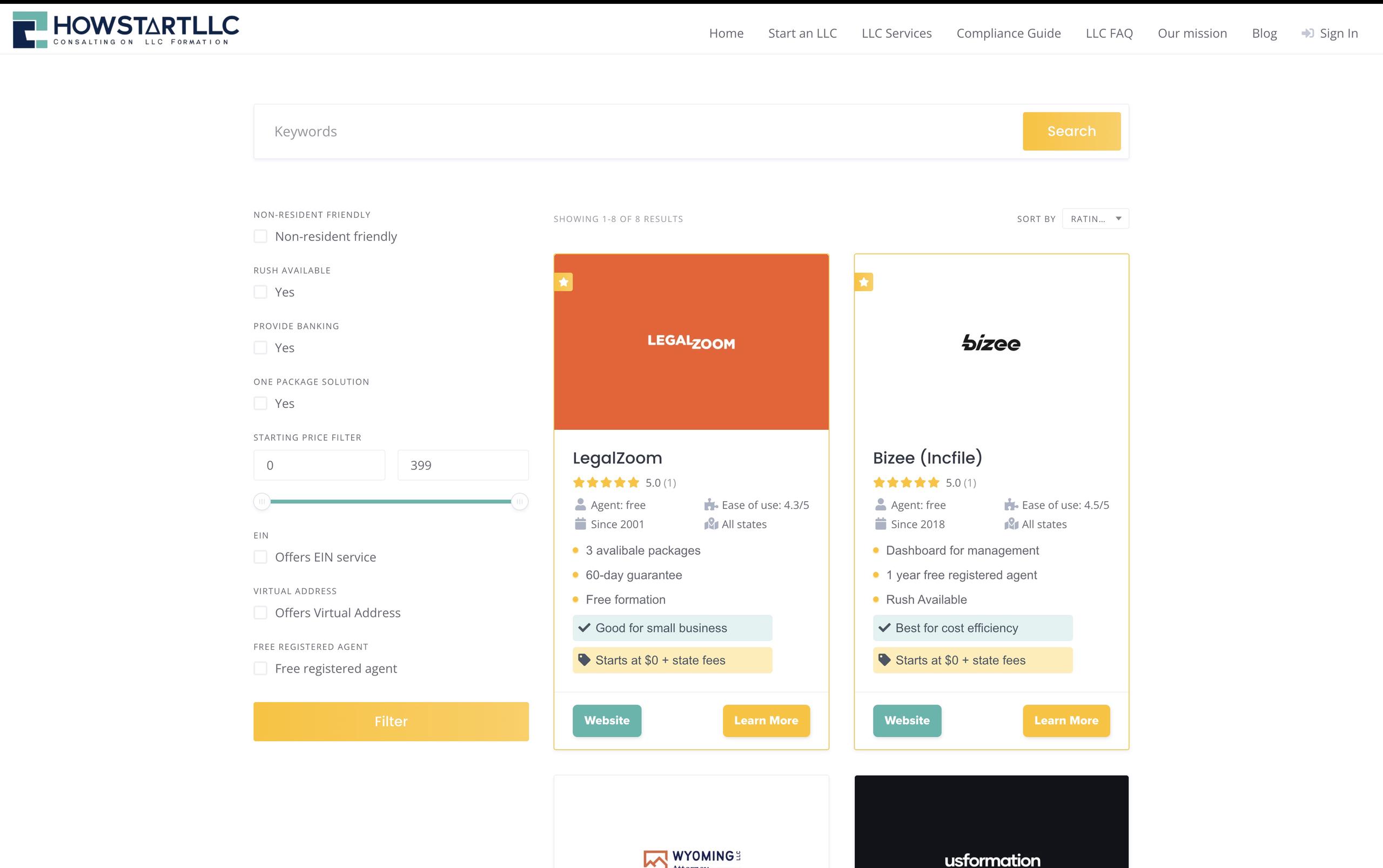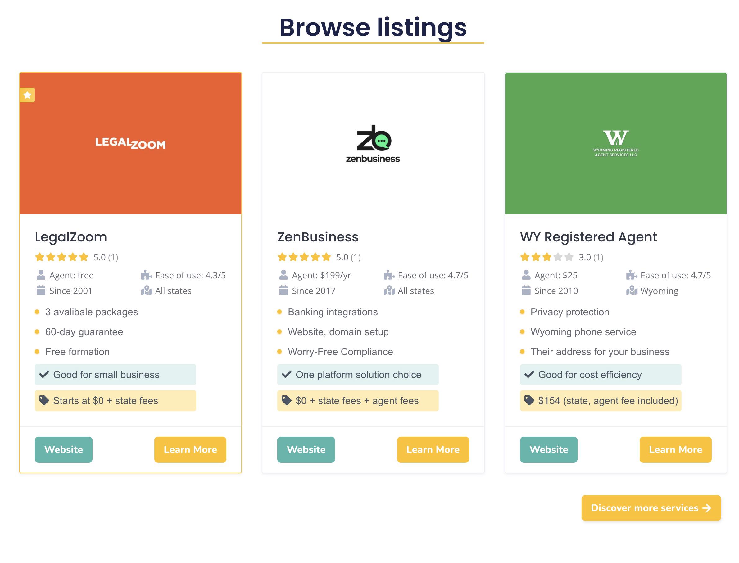Our platform aggregates detailed information on leading LLC formation services, including: