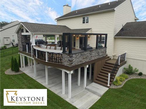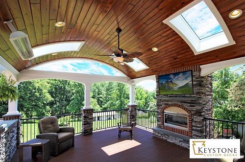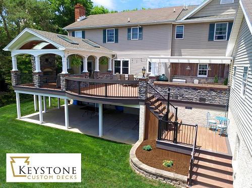 Keystone Custom Decks designs and builds custom decks, porches, pergolas, and more. We make your vision for your dream outdoor living space a reality! Create your perfect backyard living area and hosting space, complete with an outdoor kitchen, fireplace, patio, and masonry features.