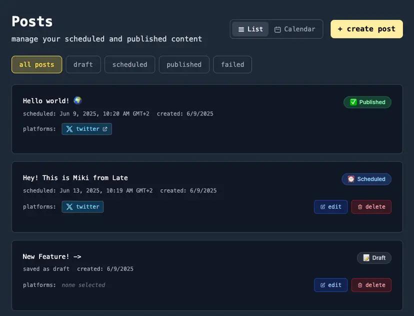 Late combines a sleek scheduler with a genuine social media API. Post and track content across Twitter, Instagram, TikTok, LinkedIn, Facebook, YouTube, Threads, Reddit, Pinterest, and Bluesky—all in one spot.