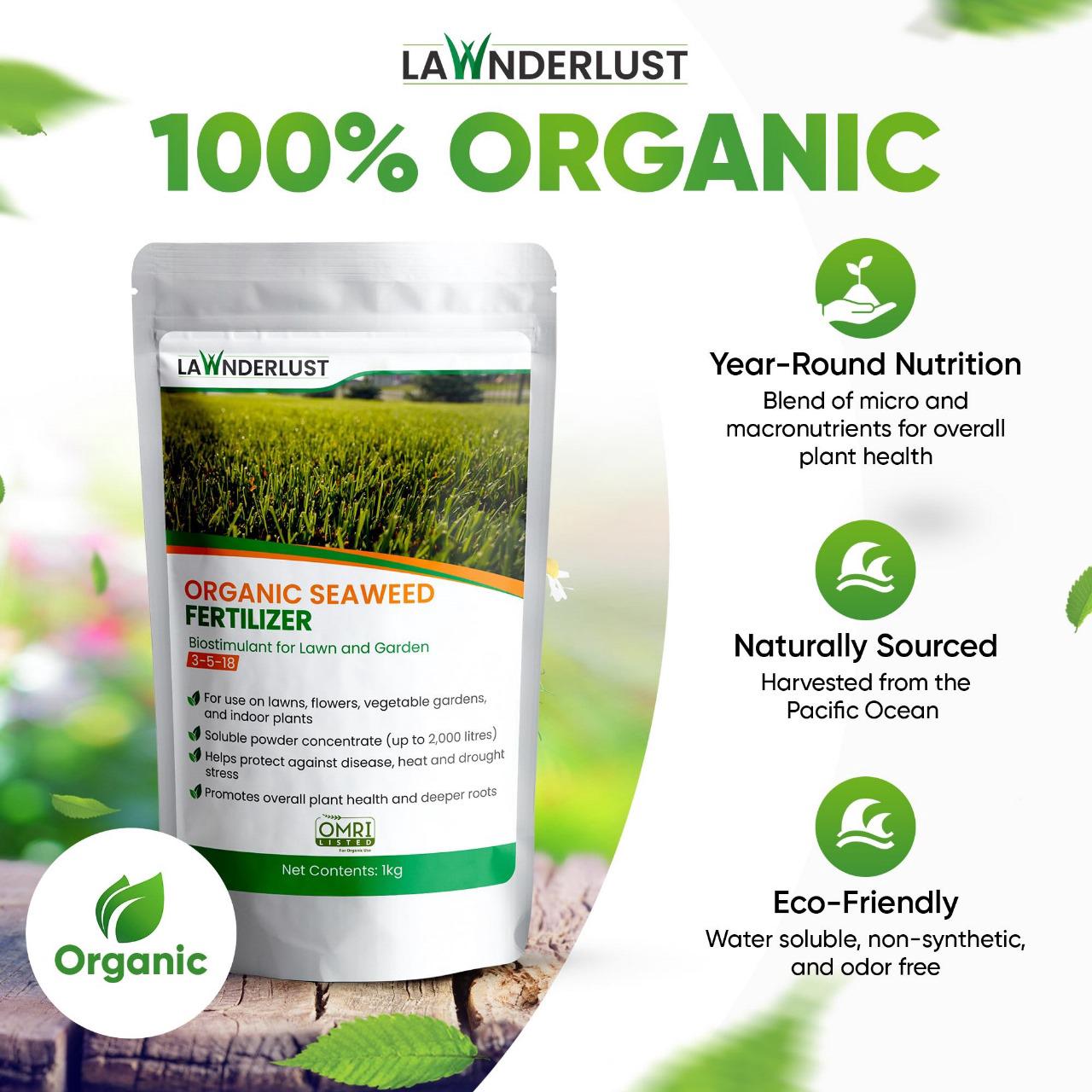 Lawnderlust offers a revolutionary organic seaweed fertilizer that transforms gardens across Canada. Our 100% organic, OMRI-certified product harnesses the power of seaweed kelp to nourish lawns, plants, flowers, and vegetables naturally. Packed with essential micro and macronutrients, Lawnderlust's fertilizer promotes vigorous growth, deeper roots, and increased resilience against stress and disease. Environmentally friendly and safe for pets, our odor-free, non-toxic formula dissolves completely in water, making application a breeze. One bag creates an impressive 2,000 liters of fertilizer, ensuring excellent value for eco-conscious gardeners. Experience noticeable results in just 2-3 weeks and enjoy a lush, vibrant landscape year-round. Choose Lawnderlust for a sustainable approach to lawn and garden care that supports both plant health and environmental stewardship.