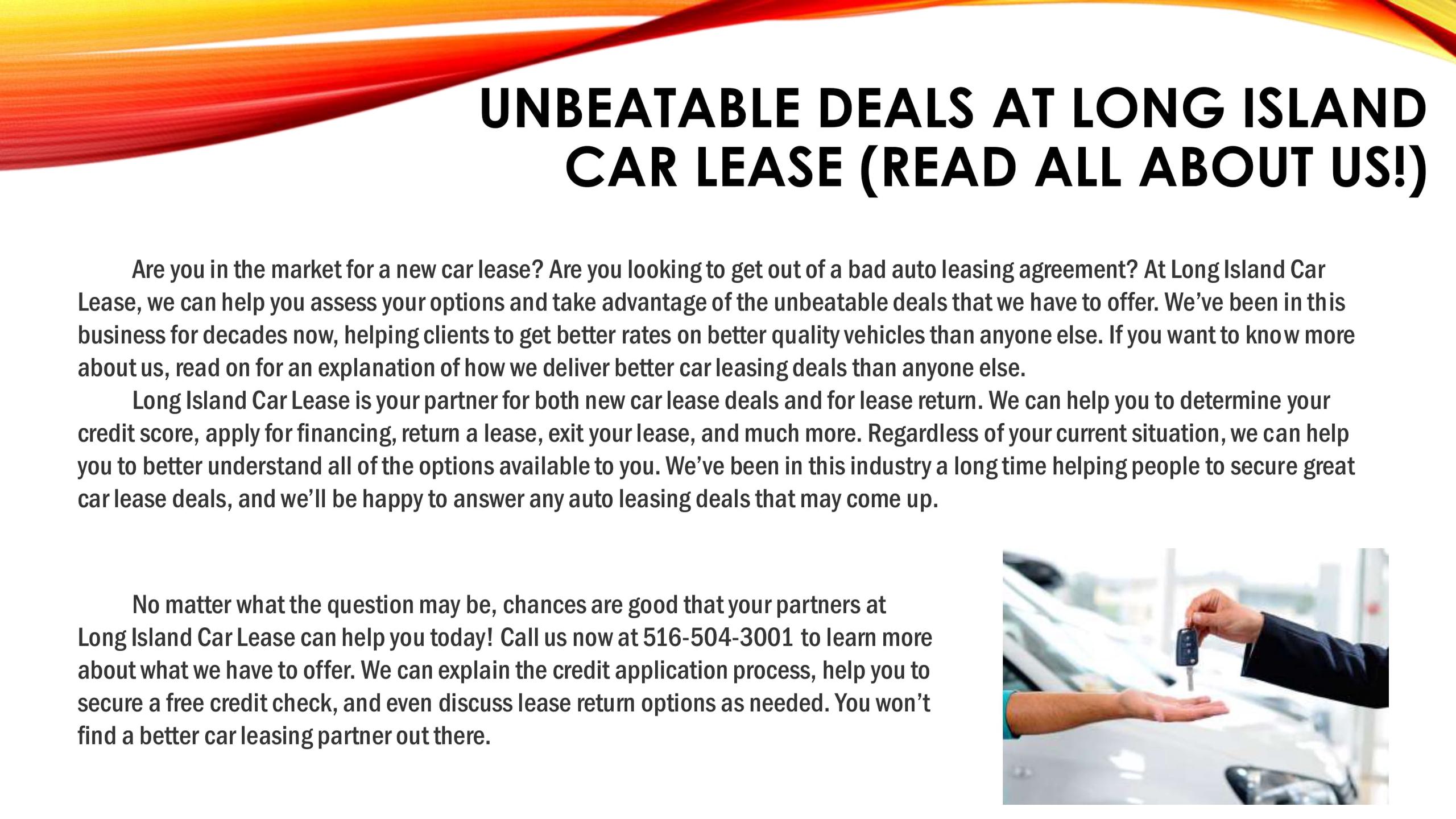 Long Island Car Lease is your partner for both new car lease deals and for lease return. We can help you to determine your credit score, apply for financing, return a lease, exit your lease, and much more. Regardless of your current situation, we can help you to better understand all of the options available to you. We’ve been in this industry a long time helping people to secure great car lease deals, and we’ll be happy to answer any auto leasing deals that may come up. No matter what the question may be, chances are good that your partners at Long Island Car Lease can help you today! Call us now at 516-504-3001 to learn more about what we have to offer. We can explain the credit application process, help you to secure a free credit check, and even discuss lease return options as needed. You won’t find a better car leasing partner out there.