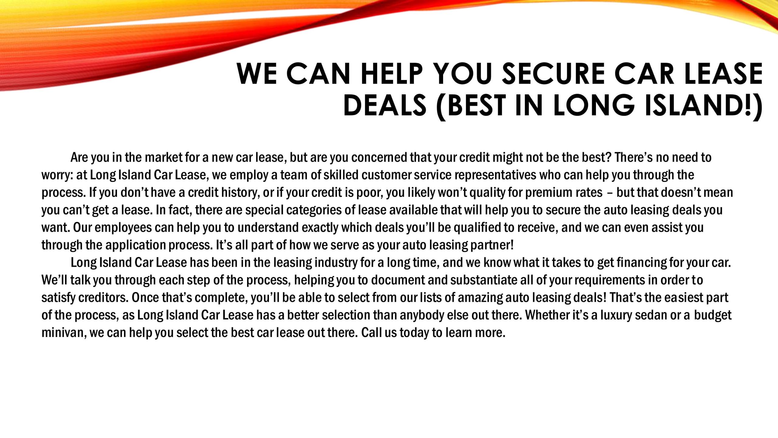 Are you in the market for a new car lease, but are you concerned that your credit might not be the best? There’s no need to worry: at Long Island Car Lease, we employ a team of skilled customer service representatives who can help you through the process. If you don’t have a credit history, or if your credit is poor, you likely won’t quality for premium rates – but that doesn’t mean you can’t get a lease. In fact, there are special categories of lease available that will help you to secure the auto leasing deals you want. Our employees can help you to understand exactly which deals you’ll be qualified to receive, and we can even assist you through the application process. It’s all part of how we serve as your auto leasing partner!
