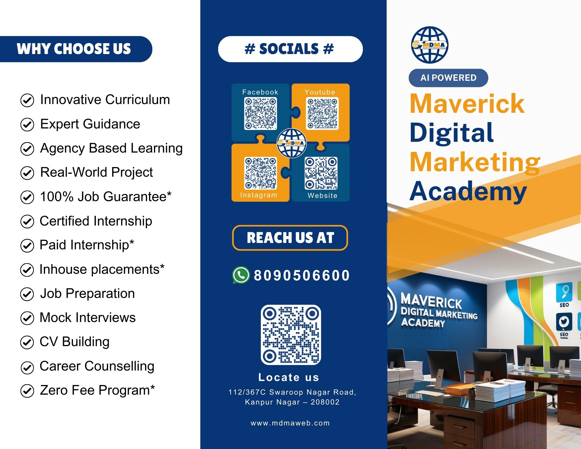 MDMA - Maverick Digital Marketing Academy is Kanpur's premier institute for practical, results-driven digital marketing education. Born from a vision to make cutting-edge digital skills accessible to all, we specialize in transforming beginners into industry-ready professionals through hands-on training in SEO, Google Ads, social media marketing, and business listing optimization. Our real-world approach sets us apart - students don't just learn theory; they work on live projects, build professional portfolios, and gain actual client experience. Whether you're a student seeking career opportunities, an entrepreneur looking to grow your business, or a professional aiming to upskill, our customized programs are designed to deliver immediate value. Based in Kanpur but with a digital-first mindset, we're committed to bridging the skills gap in Uttar Pradesh's digital economy while helping local businesses thrive online. At MDMA, we don't just teach marketing - we create marketing professionals ready to make an impact from day one.
