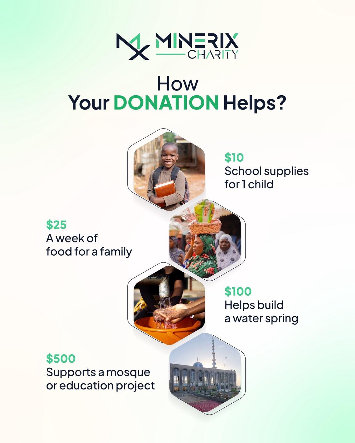 Minerix Charity is the humanitarian arm of Minerix. Minerix Charity is dedicated to creating a lasting impact through compassion, community, and sustainable support. Rooted in the belief that technology and kindness can go hand in hand, Minerix Charity channels a portion of crypto-powered investments into meaningful causes. Our charity projects ranging from food and water distribution to education, medical aid, and emergency relief. With a global vision and local action, we strive to uplift underprivileged communities and bring hope where it’s needed most. Every contribution, no matter how small, helps build a better tomorrow.