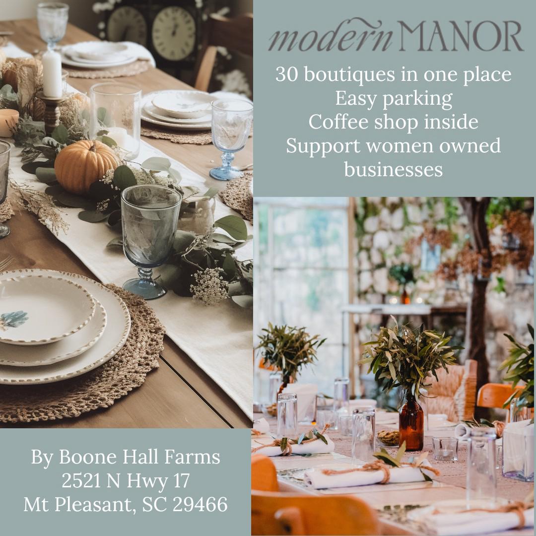 Modern Manor is Mt Pleasant’s premier lifestyle boutique offering curated women’s clothing, designer accessories, stylish shoes, unique home décor, custom furniture, interior design services & specialty coffee. Shop trendy apparel, statement jewelry, coastal home accents, area rugs, artwork, mirrors & thoughtful gifts. Expert styling consultations available. Serving Charleston’s East Cooper community.