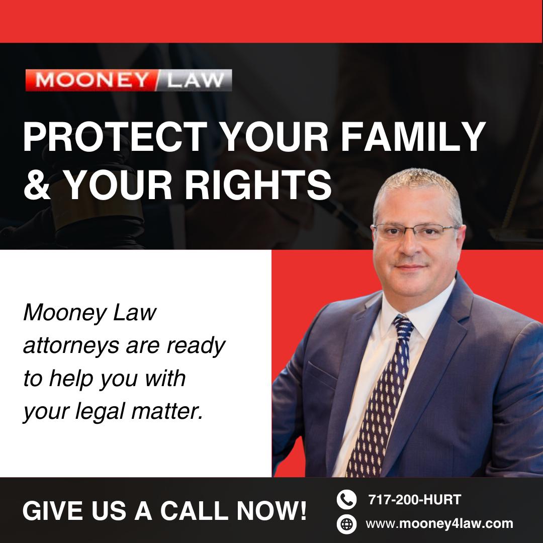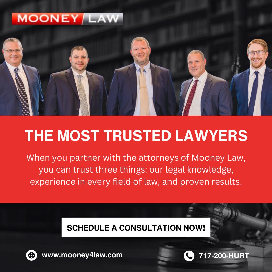 Mooney Law has served Central Pennsylvania and Northern Maryland for decades as a unique, boutique law firm that can handle all your legal needs, including Personal Injury, Car Accidents, Workers Compensation, Social Security, and more. Mooney Law has a large general practice, representing clients in Family Law, Criminal Defense, Civil Litigation, and Business Formation. Mooney Law also offers clients a Bankruptcy practice and an Advance Estate Planning and Estate Administration practice. With 16 offices and 18 attorneys, you can Count on Mooney for all your legal needs.