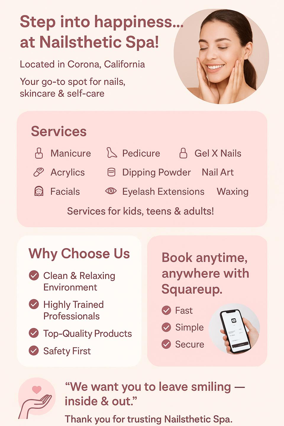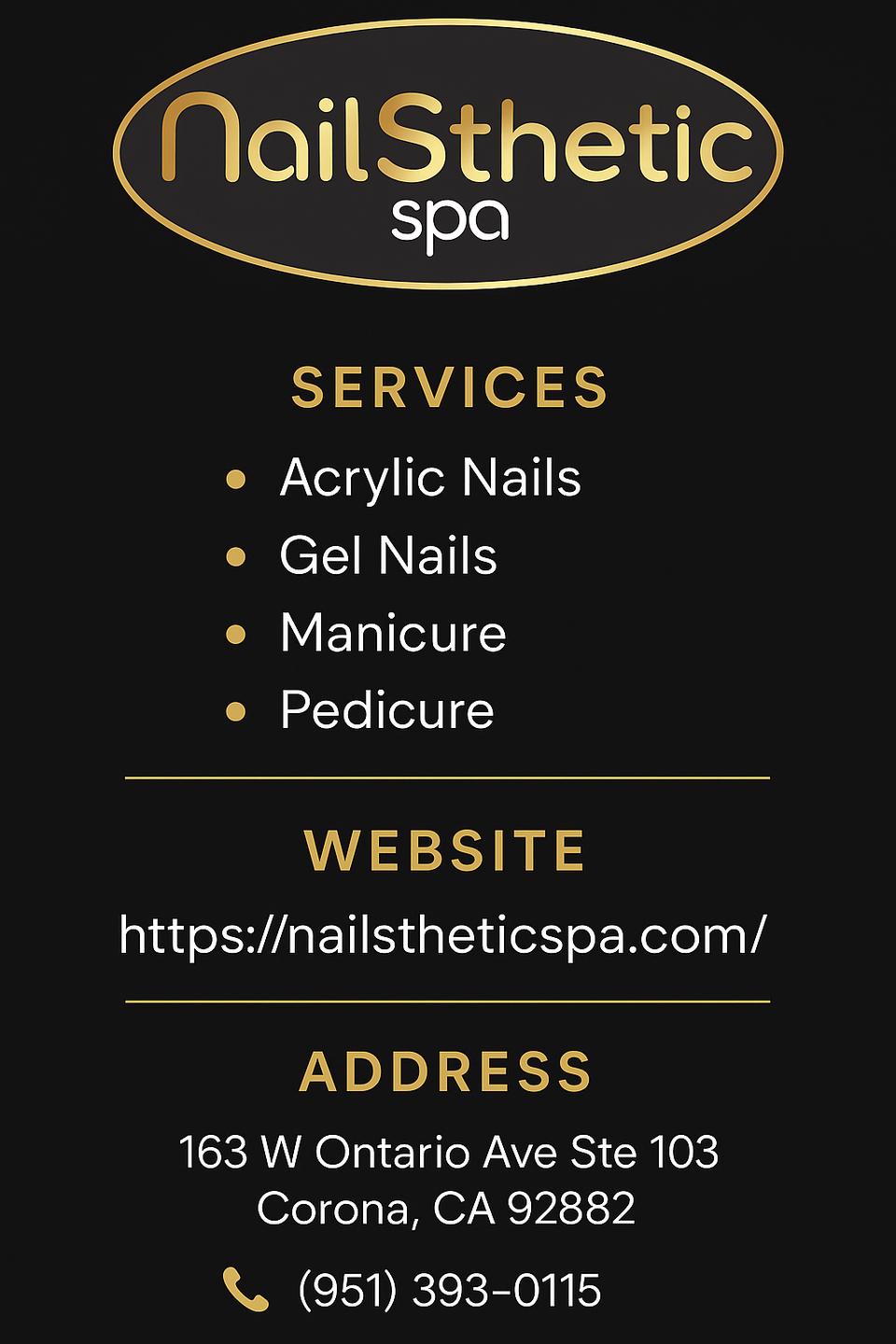 Best Nail Salon in Corona, CA 92882 – Nailsthetic Spa. With over 10 years of experience and 10,500+ satisfied clients, we offer manicure, pedicure, acrylic, gel-x, hard gel, dipping powder, french manicure, nail art, structure gel, gel polish, chrome, cat-eye, gel pedicure, cuticle care, paraffin wax, and therapeutic CBD/detox pedicures. We also provide signature facials, microdermabrasion, collagen anti-ageing facial, ultrasonic facial, oxygen facial, acne treatment, micro-needle facial, eyelash extensions, micro-blading, body wax, facial wax, and Brazilian wax. Step into a clean, comfortable, and welcoming atmosphere that elevates your beauty experience.