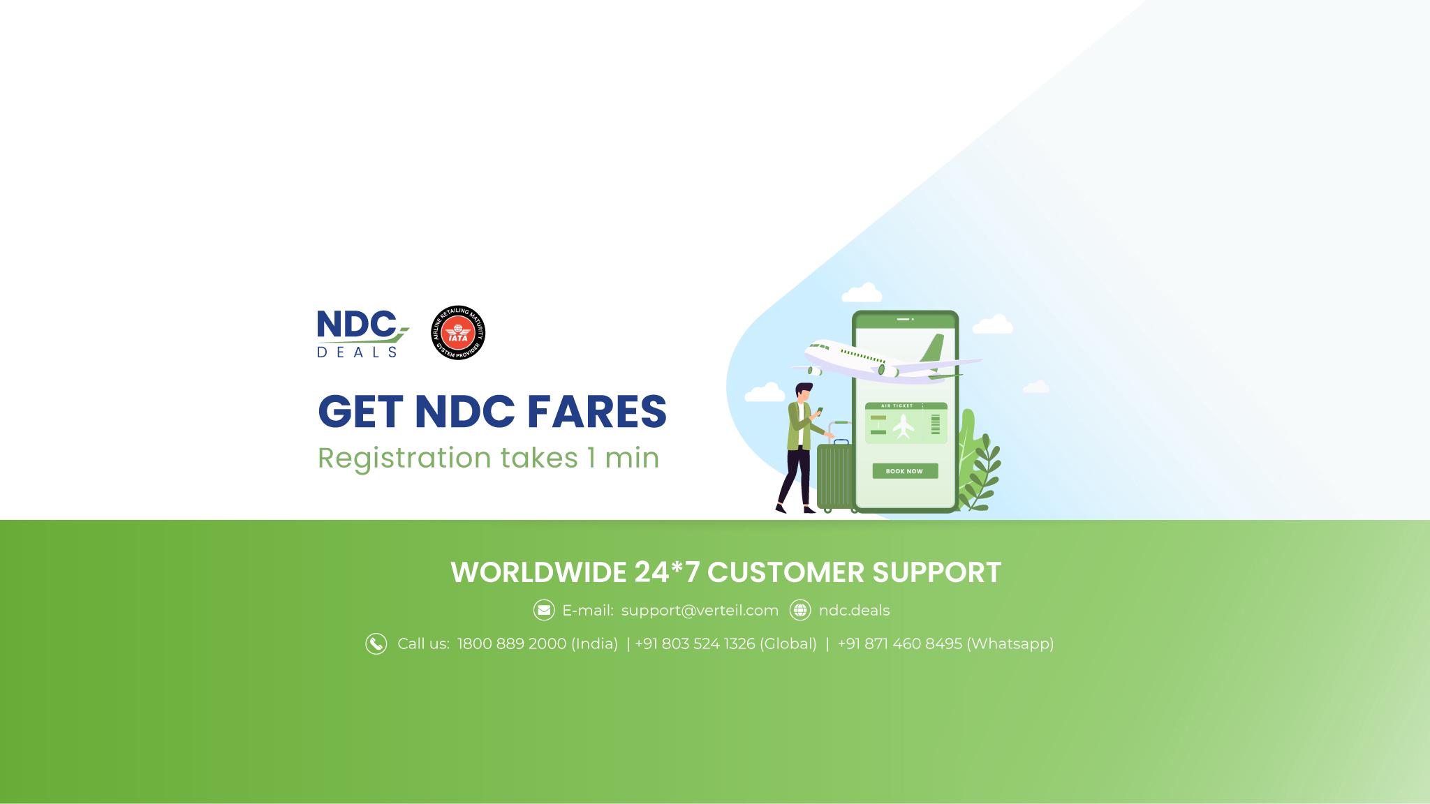 NDC Deals is a flight and ancillary booking portal, that gets you NDC fares directly from our partner Airlines. Onboard yourself as a complete travel agent in 5 minutes! Hold, Issue, Cancel, Refund and Reissue tickets on International airlines on your own without a third party involvement and earn attractive incentives.