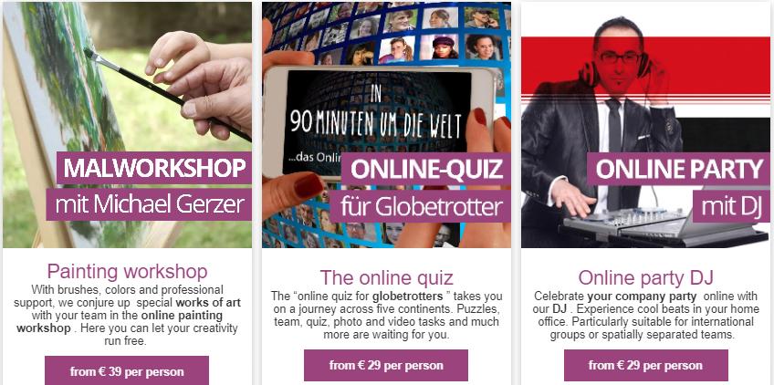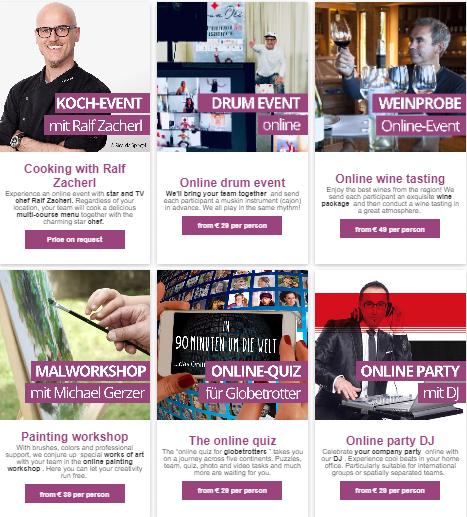 Buchen Sie die besten virtuellen und Outdoor-Teambuilding-Events online mit Online-Teamevents. Mit unseren Online-Events stärken Sie trotz Corona und Abstandsregeln den Teamgeist und den persönlichen Kontakt. Für weitere Informationen besuchen Sie unsere Website.